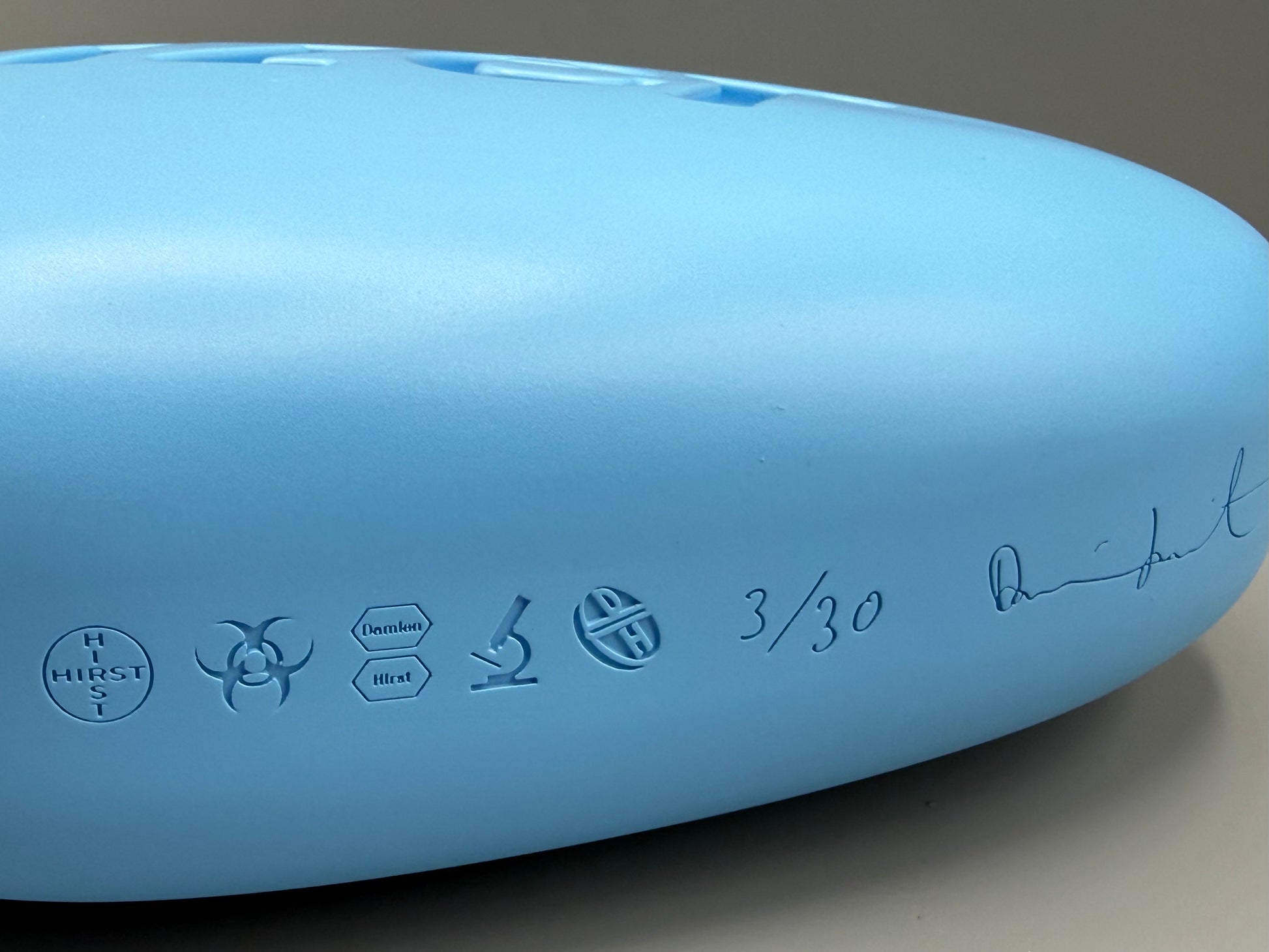 Damien Hirst’s Pharmaceutical Series delves into themes of medicine, mortality and consumerism. The oversized large Damien Hirst 2014 Baby Blue Viagra Multiple Table Top Sculpture humorously critiques society’s reliance on pharmaceuticals and transforms a mundane object into a symbol of contemporary life. Its soft blue color and smooth, pill-like form emphasize its direct reference, blurring the boundaries between art and everyday objects. It is seductive.
